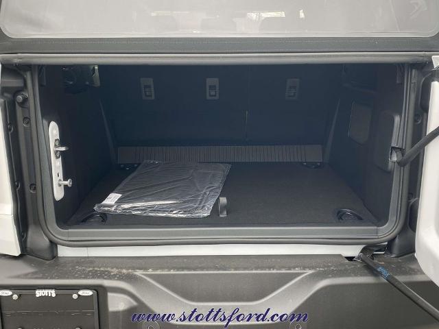 Finished in classic Oxford White, this Bronco stands out with the Black Appearance Package, featuring bold styling, 17 black wheels, and all-terrain tires. Designed for adventure, it includes G.O.A.T. Modes (Goes Over Any Terrain), removable doors and top, and rugged 4x4 capability.