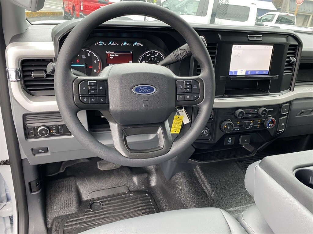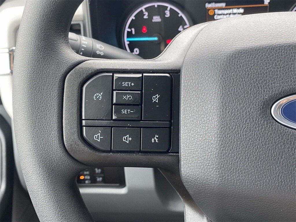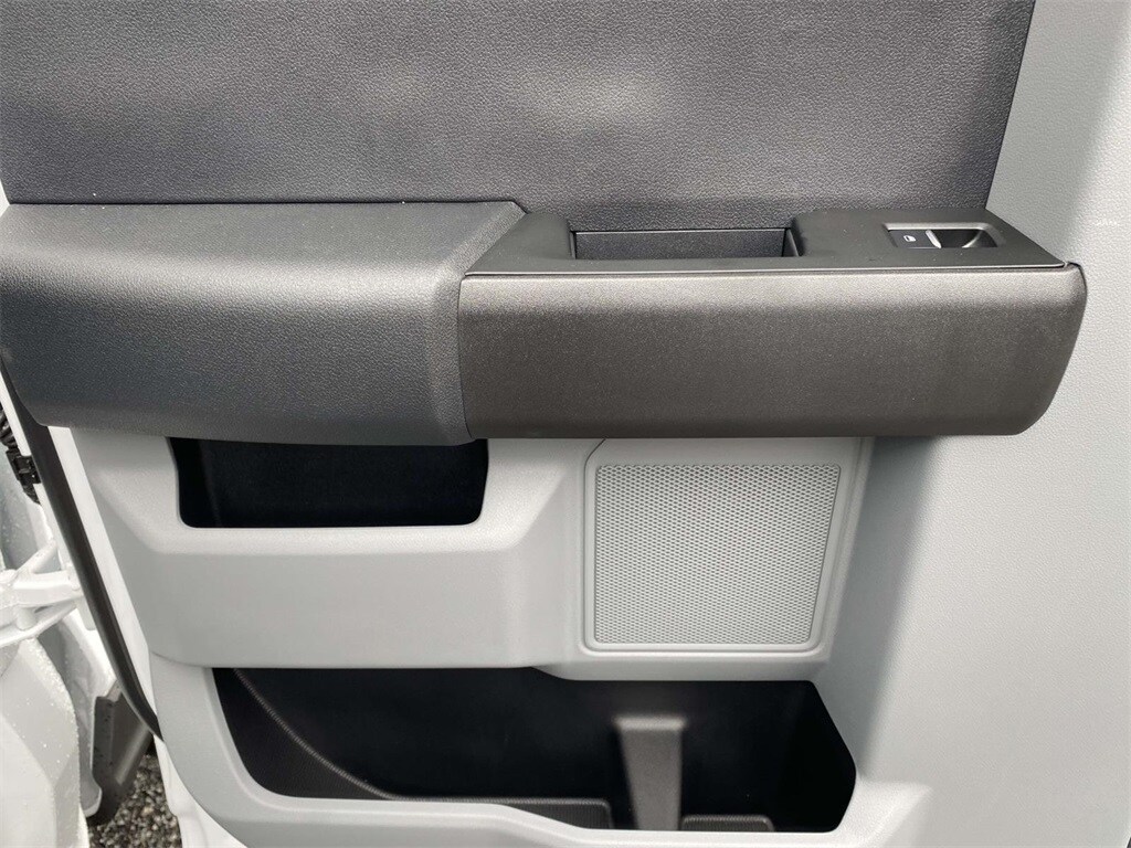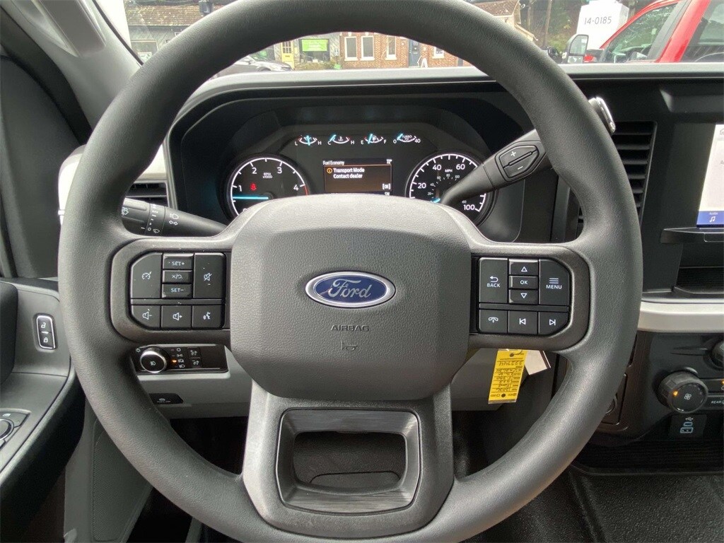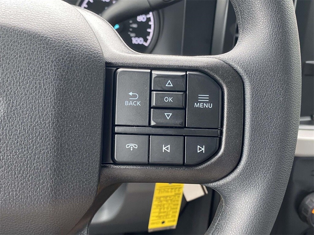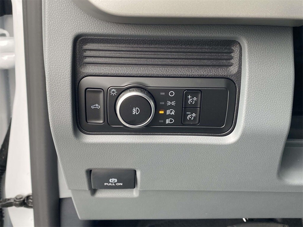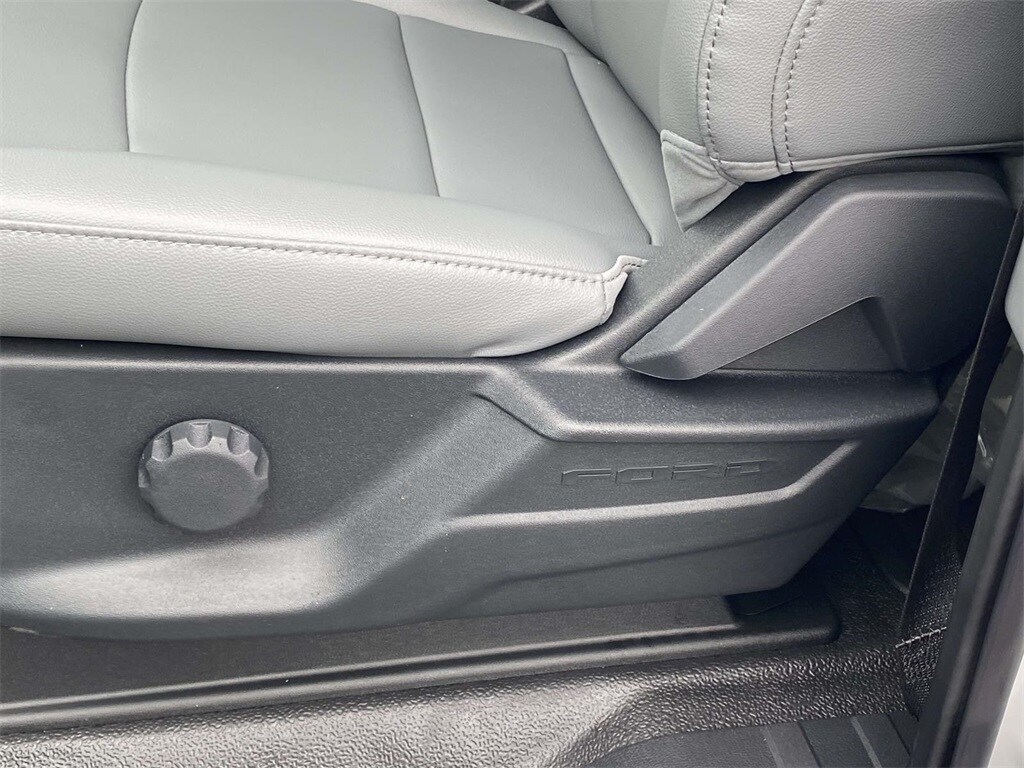 On the outside, the Oxford White exterior features trailer tow mirrors, power sliding rear window, platform running boards, and privacy glass. Inside, you'll find a durable Medium Dark Slate vinyl interior with manual lumbar support, SYNC 4 with 8" touchscreen, and a 120V/400W outlet for on-the-job convenience.
